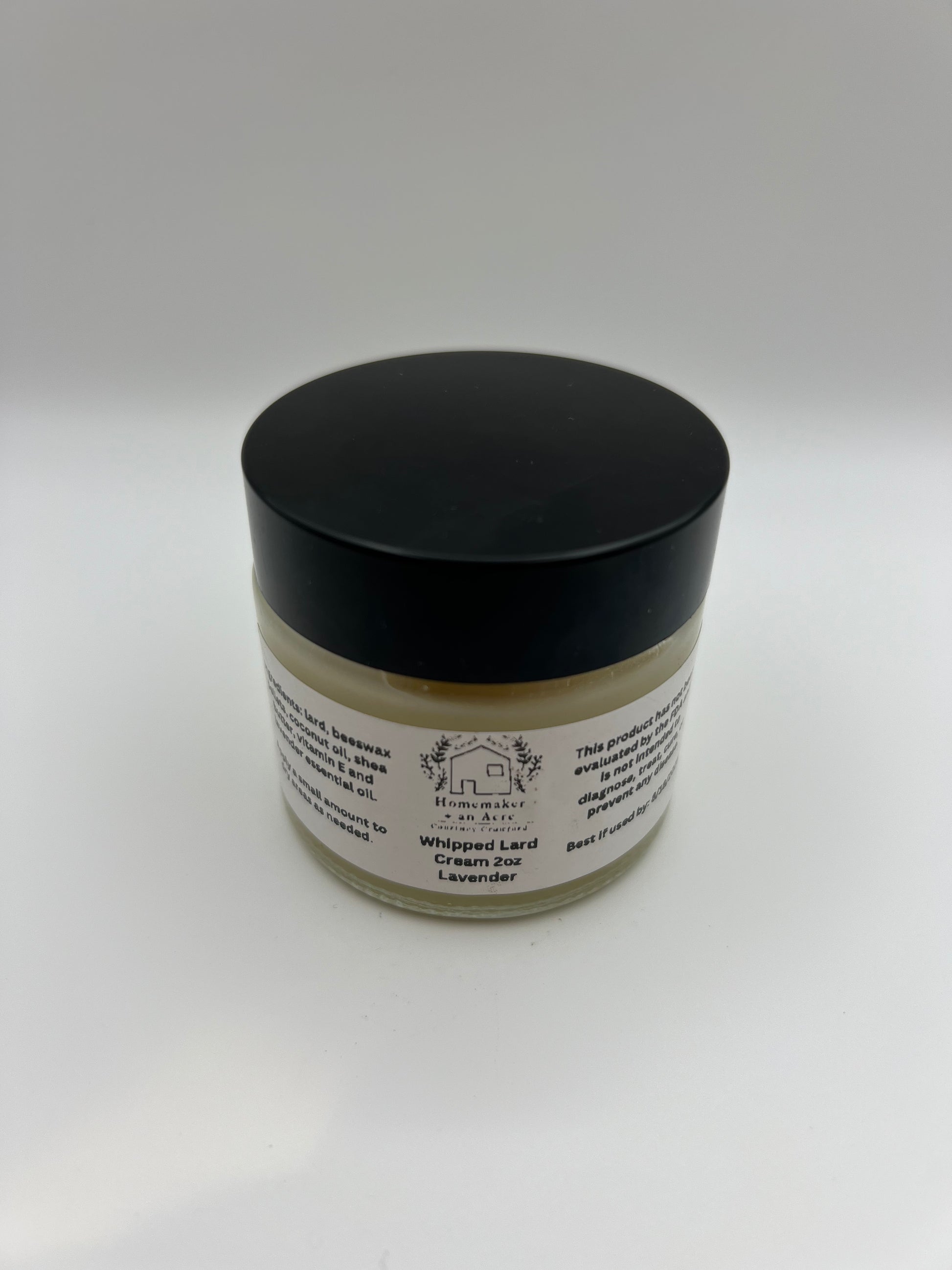 This rich, fluffy cream is handcrafted with pasture-raised lard, organic beeswax pellets, organic coconut oil, organic shea butter, and organic vitamin E. Whipped to a light, airy texture, it glides on smoothly and absorbs beautifully—leaving your skin soft, supple, and deeply hydrated.